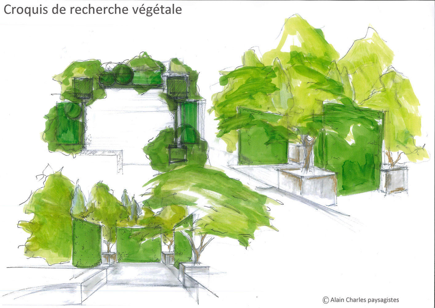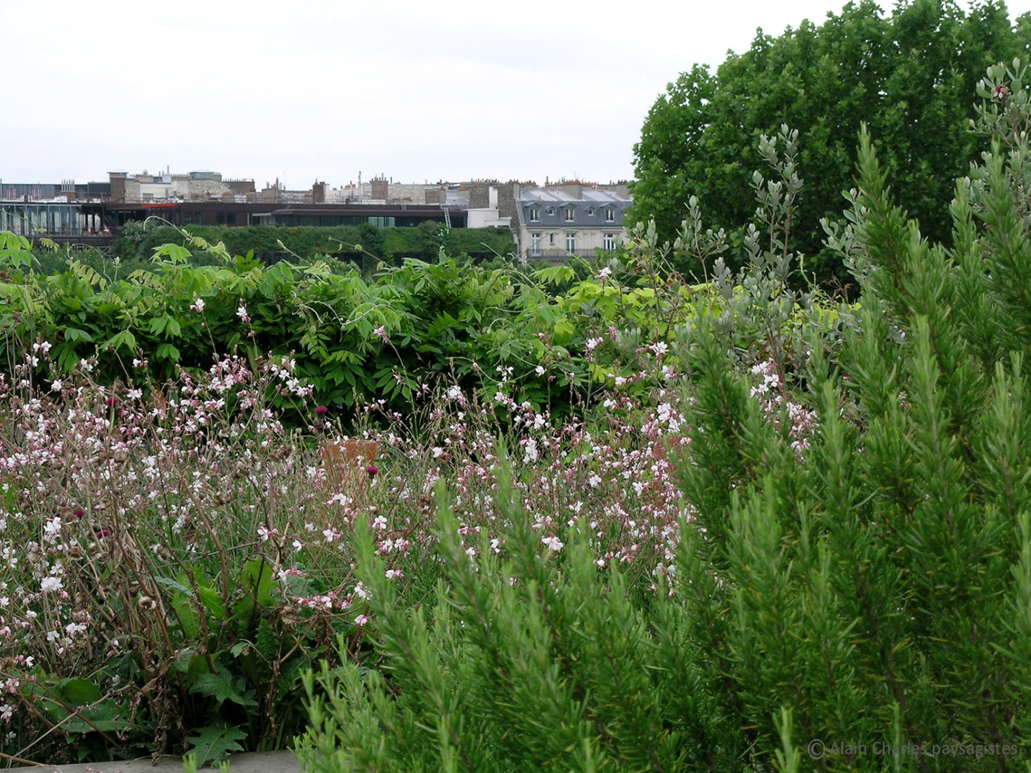 Sur un plan masse relativement simple qui a épaissi le périmètre de la terrasse, nous avons planté largement des végétaux de forme libre, du petit arbre, de l’arbuste dense au champ de graminées. Les bâtiments alentour disparaissent, seuls quelques toits émergent derrière les vivaces. Lovée dans ce nouvel écrin où les plantes s’épanouissent, débordent. La terrasse devient salle de déjeuner, lieu de sieste, ou terrain de jeux ; un lieu de liberté en somme !